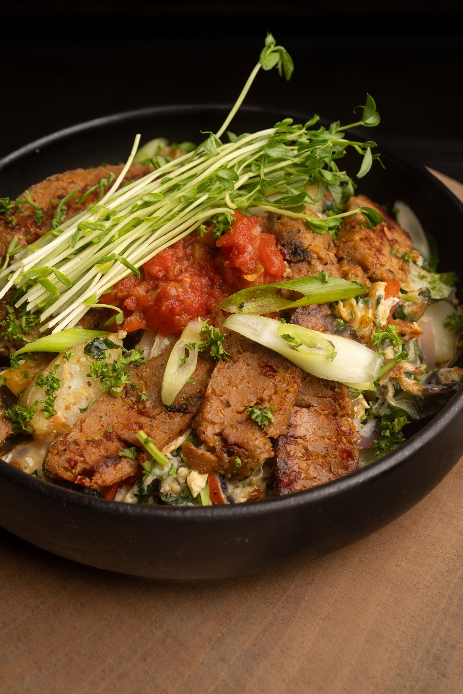 Two scrambled eggs mixed chard, onions, mushrooms, peppers, potato, kale & plant based sausage. Topped with cheddar, green onion and salsa.