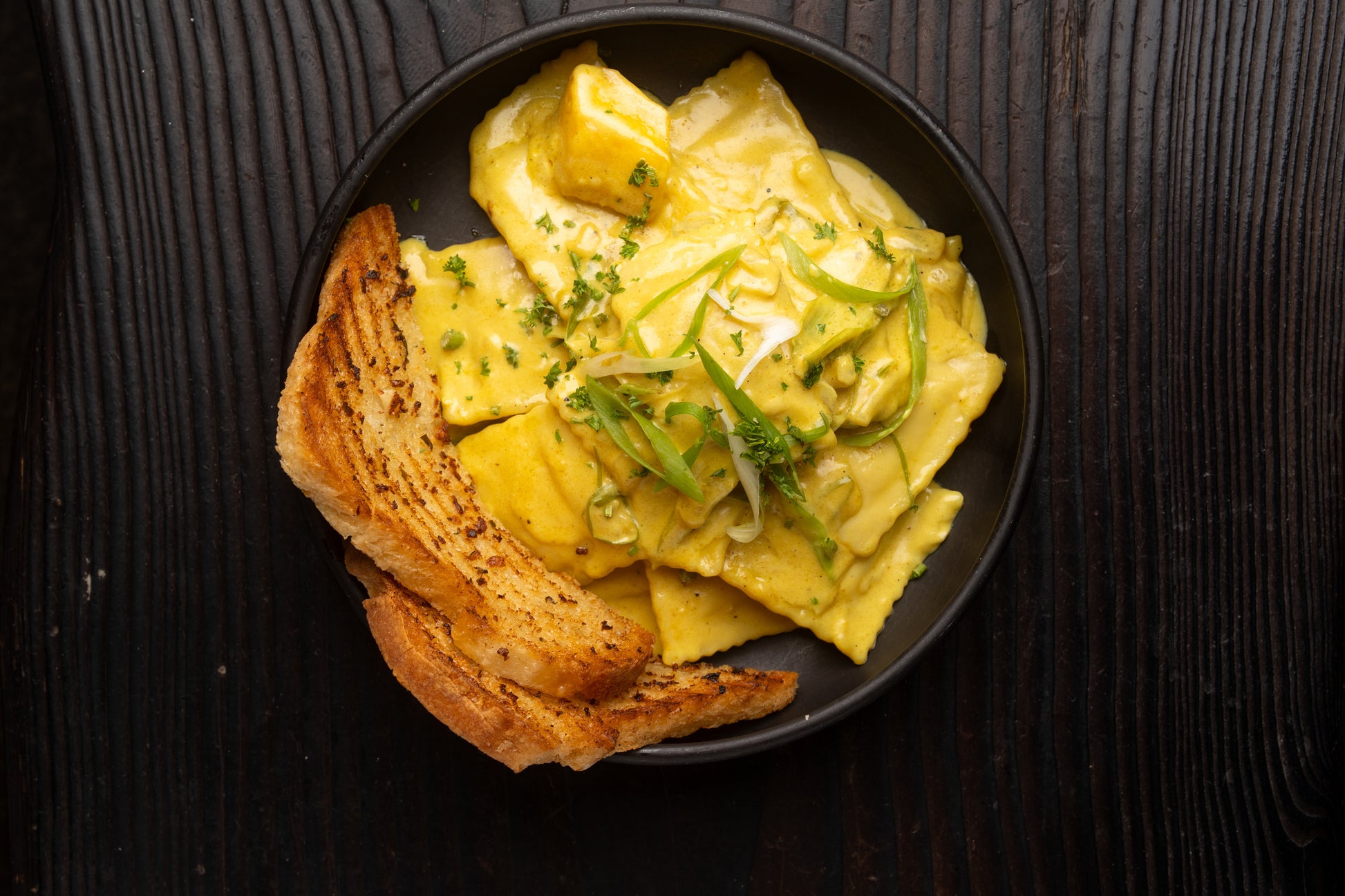 Fresh local squash ravioli in a rich mango curry sauce, served with garlic bread