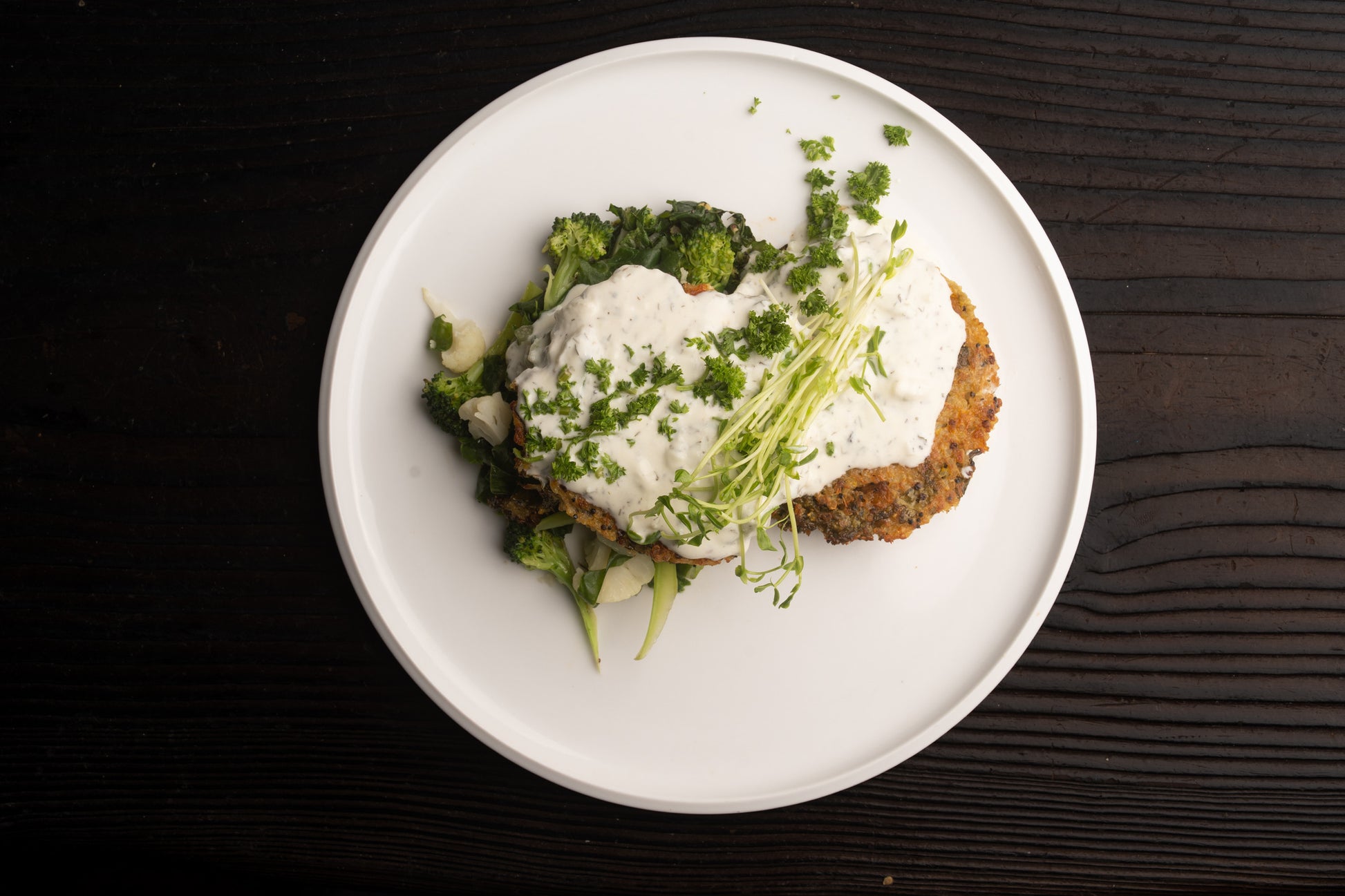 2 grilled butternut squash, feta and kale patties, served on a bed of local steamed greens, topped with house made tzatziki