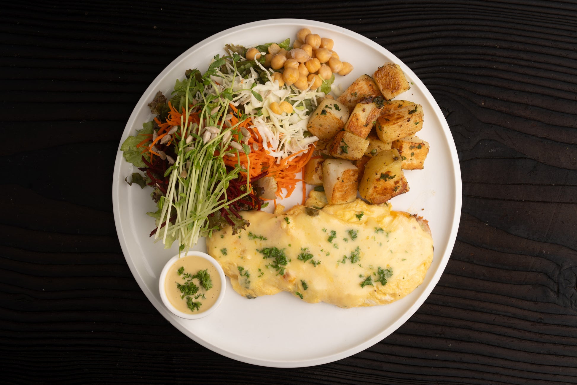 Two omelette style eggs with veggies, melted cheese, brown rice or potatoes, and a small side salad
